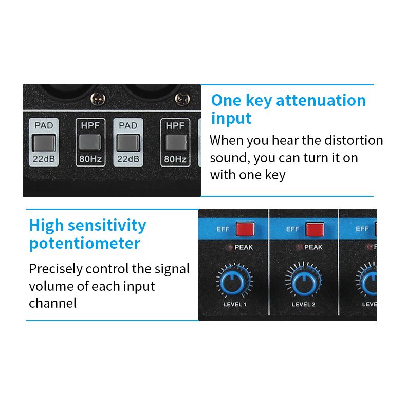 - All microphone inputs adopt an independent low-noise microphone preamplifier.